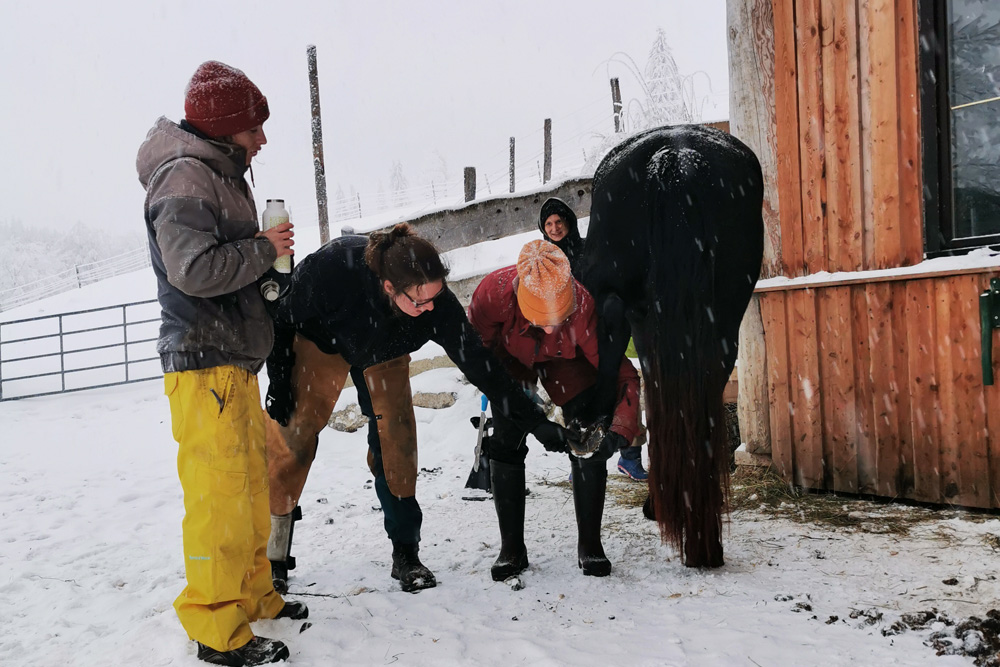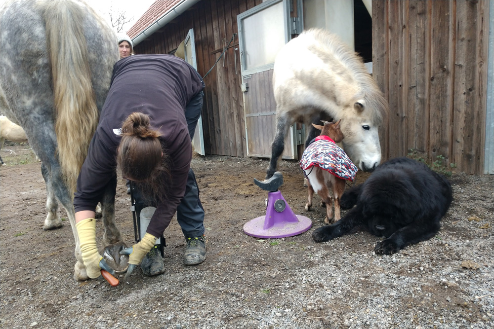 Ich komme zu dir in den Stall und gemeinsam evaluieren wir die Hufsituation deines Pferdes. Wie sehen die Hufe aktuell aus, wie wirkt sich die momentane Haltung aus, sollte die Fütterung optimiert werden? Danach geht es an die Bearbeitung: unter meiner Aufsicht bearbeitest du die Hufe deines eigenen Pferdes. Wo nötig, zeige ich dir konkrete Kniffe und gebe dir Tipps, wie du nicht nur die Hufe optimieren sondern auch die Bearbeitung möglichst kraft- und nervenschonend durchführen kannst.